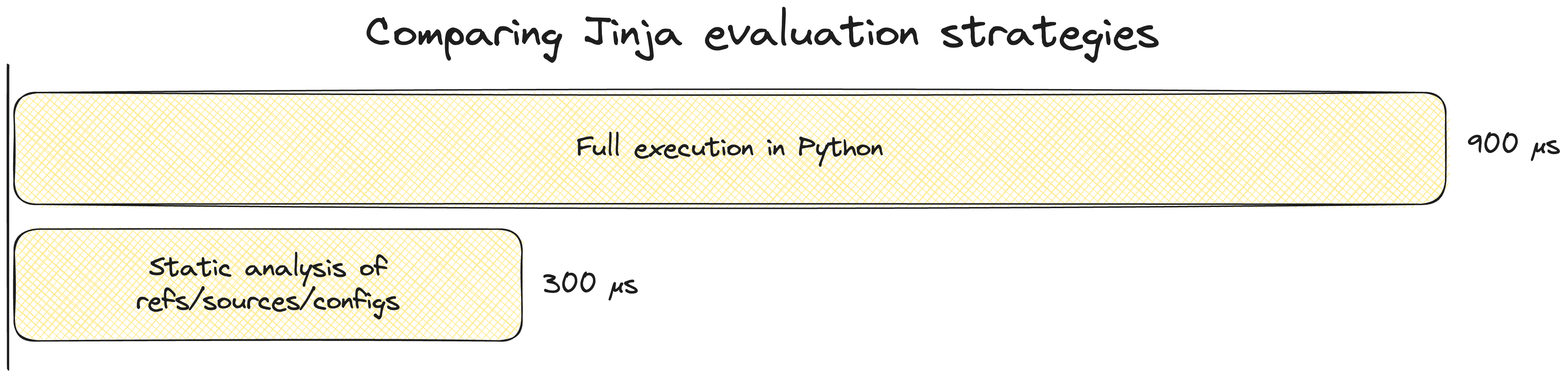 This is not the post for a deep dive on why Rust and Python have such different performance characteristics, but the key takeaway is that minijinja can fully evaluate a ref 30 times faster than today's dbt can even statically analyze it.