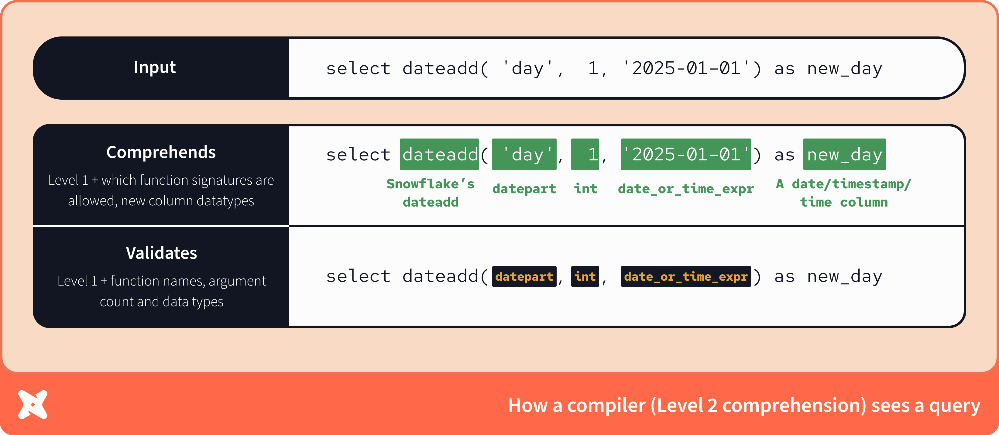 Extending beyond a parser, a compiler does know the function signatures. It knows that on Snowflake, dateadd is a function which takes three arguments: a datepart, an integer, and an expression (in that order).